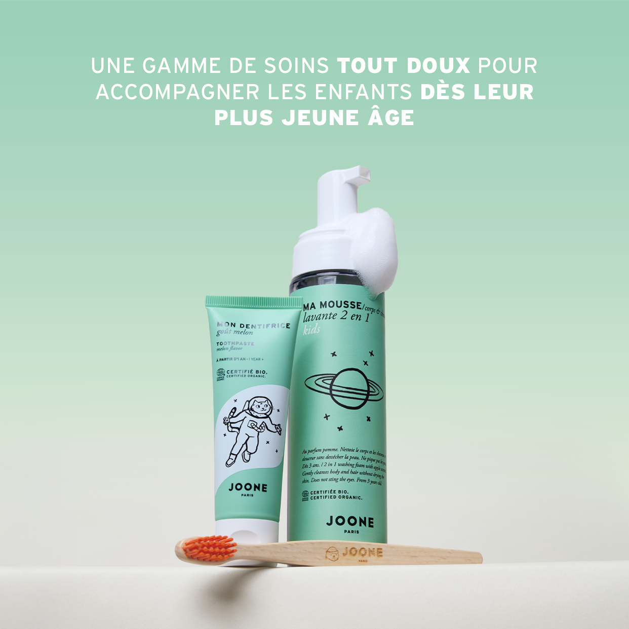 JOONE toothpaste is made with 100% natural ingredients and certified organic by Ecocert. Clinically tested under dental supervision, its clean formula is specially designed to care for young children’s sensitive gums. In compliance with European regulations, it is not tested on animals.