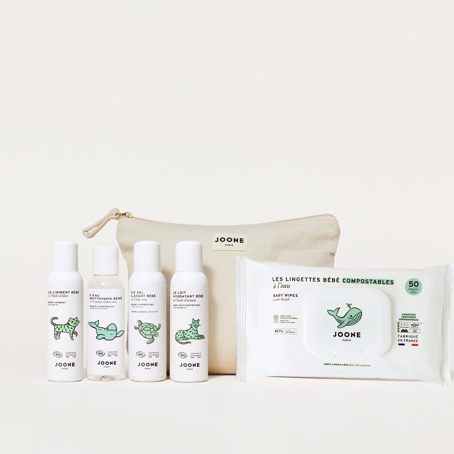 The baby care products in the JOONE Paris travel kit are clean, hypoallergenic, dermatologically tested, and free of essential oils. They are certified organic, and our wipes are COSMOS NATURAL certified by Ecocert and made in France. In accordance with European regulations, JOONE Paris care products are not tested on animals.